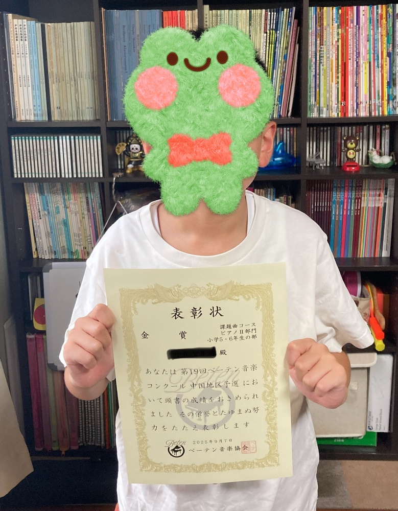 挑戦を続けるK.Cくん(小5)三次予選で銀賞だった悔しさをバネに、東広島予選にも挑戦しました。諦めずに細かい練習をし、レッスンにもたくさん通ってくれました。先生からの課題にも一生懸命取り組み、念願の🥇金賞を受賞することができました。本当に頑張った!!前回の審査員の先生方から指摘されたことを、しっかり受け止めそれを真面目に考え取り組んだ結果ですね。本人は益々欲が出て、最高点が欲しかったと(笑)また大きな目標ができましたね。まだまだ、Cくんの挑戦は続く。。。。とにかくおめでとう㊗️